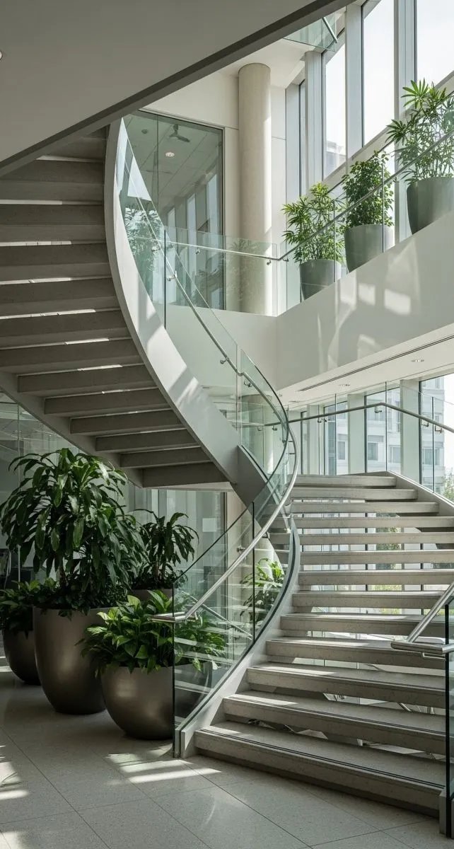 Dinamismo Elicoidale: Ideali per ingressi di prestigio o ampi open space, le scale elicoidali offrono una forma sinuosa e organica. A differenza della chiocciola classica, la mancanza del pilastro centrale permette di apprezzare la curva scultorea della struttura.